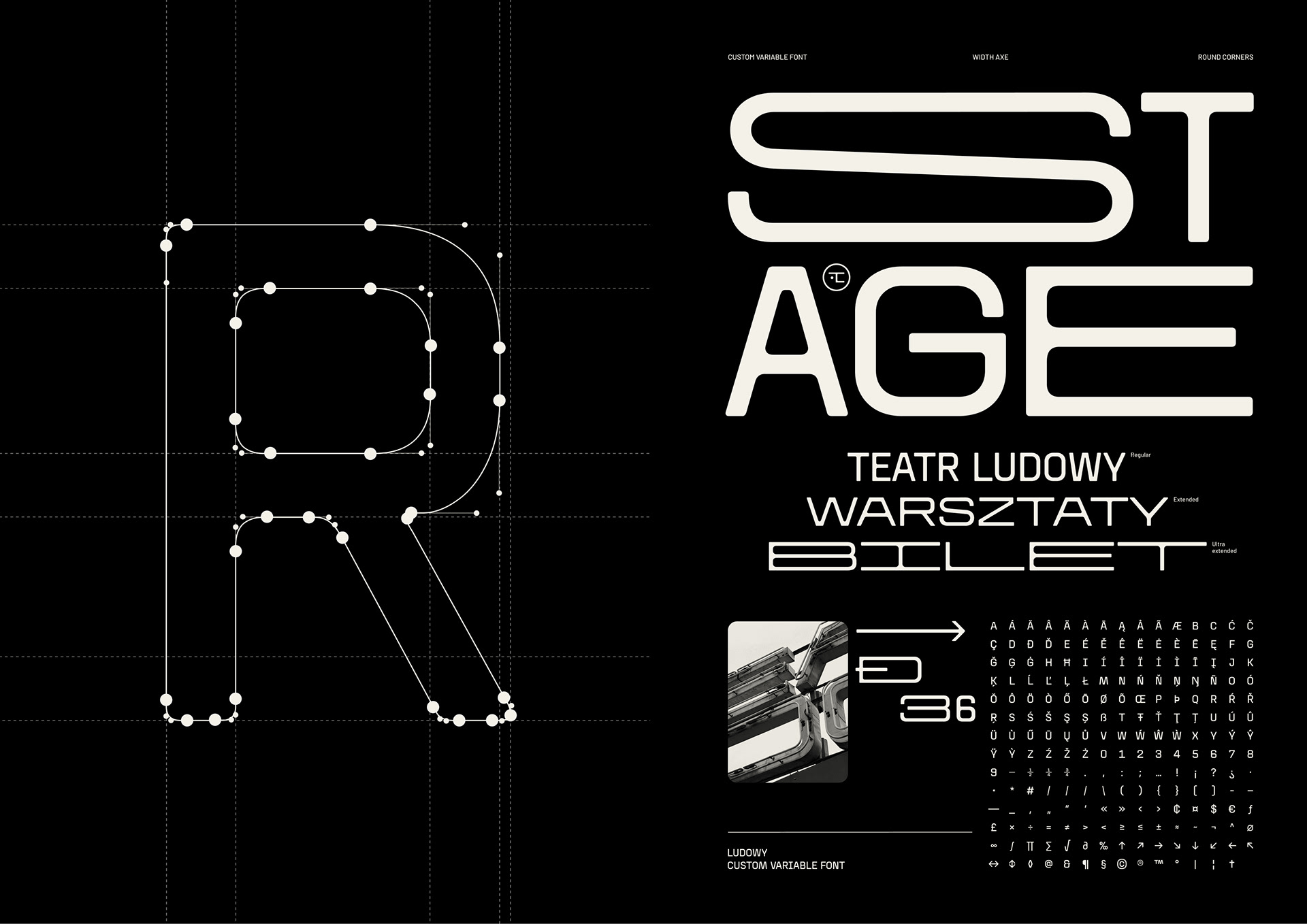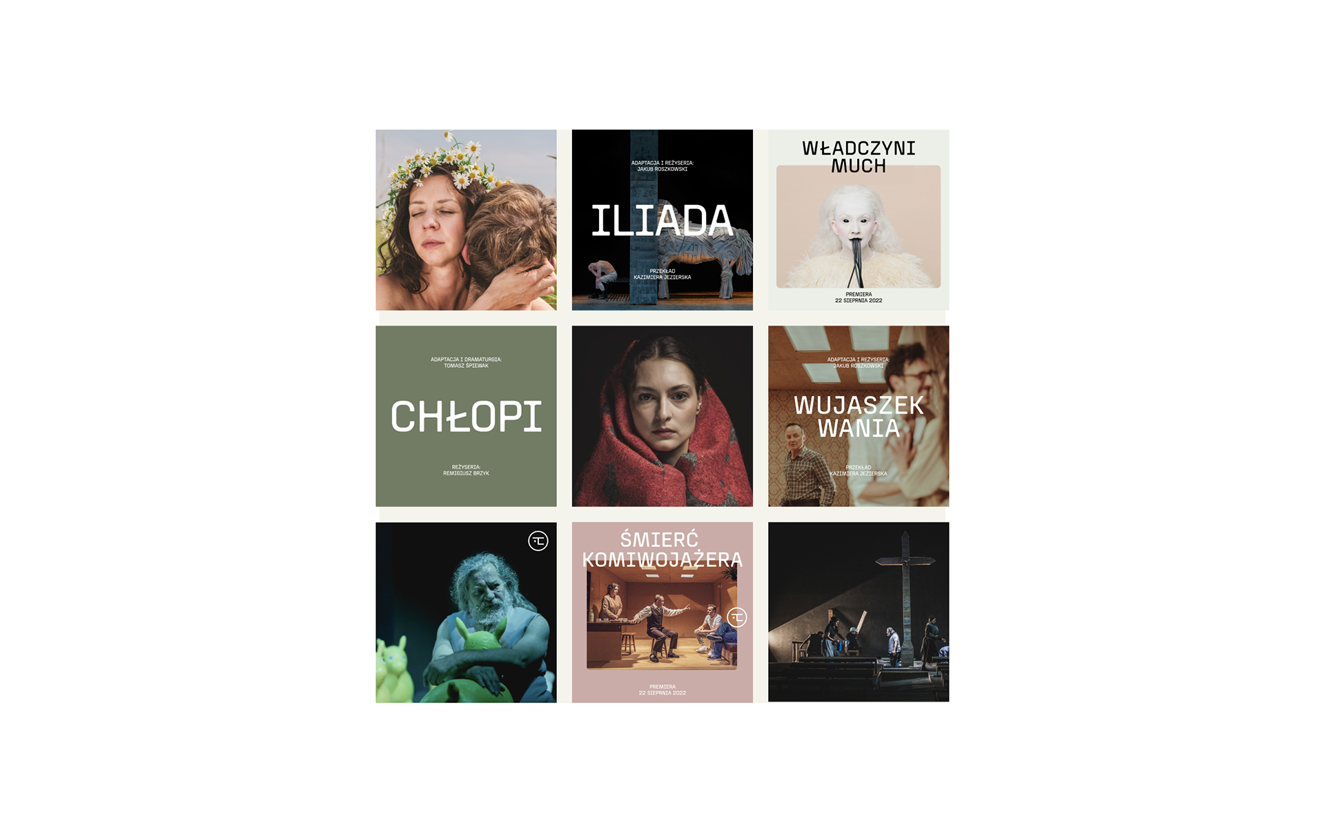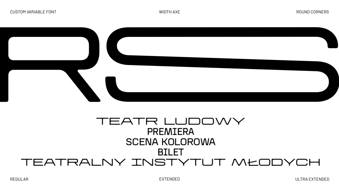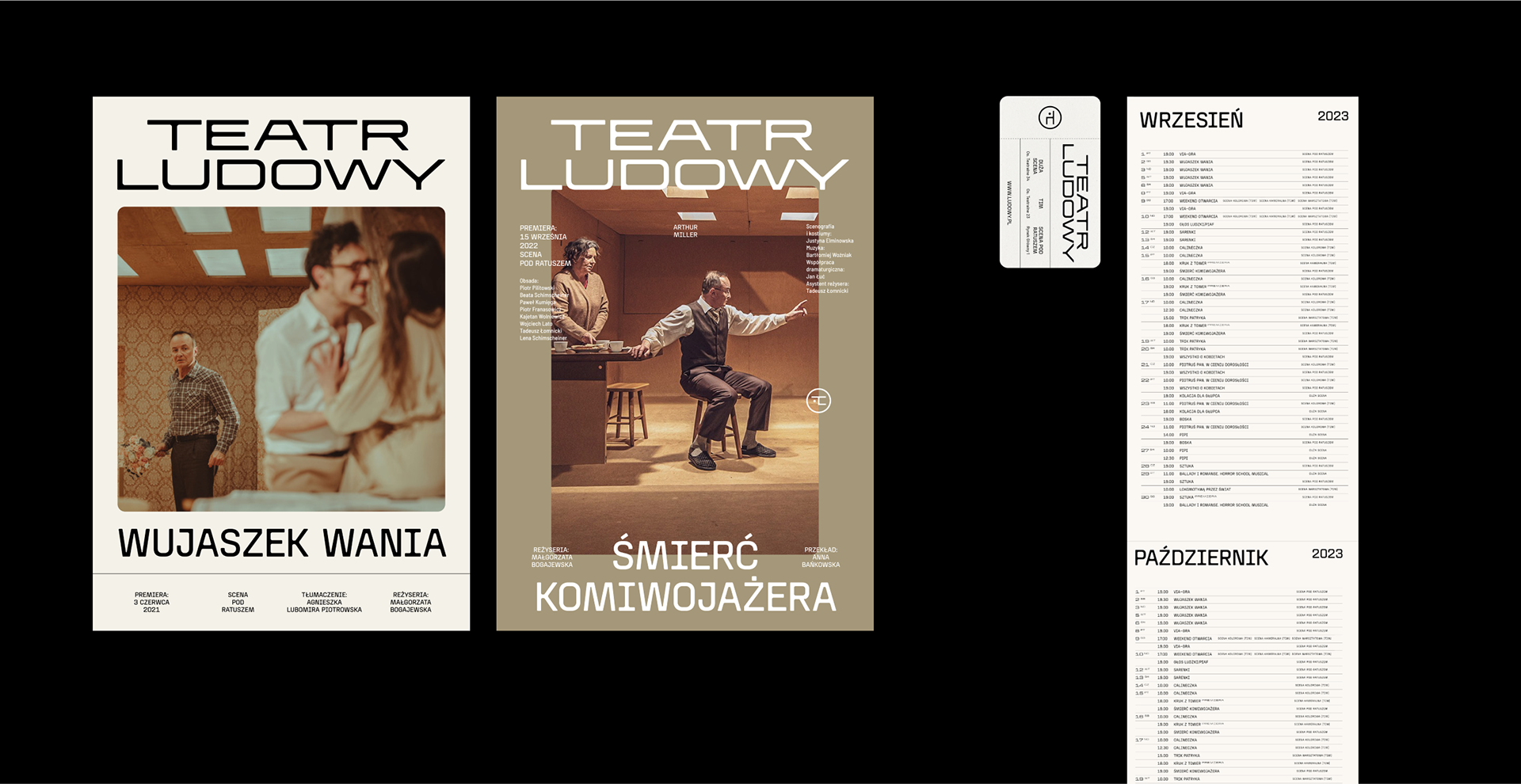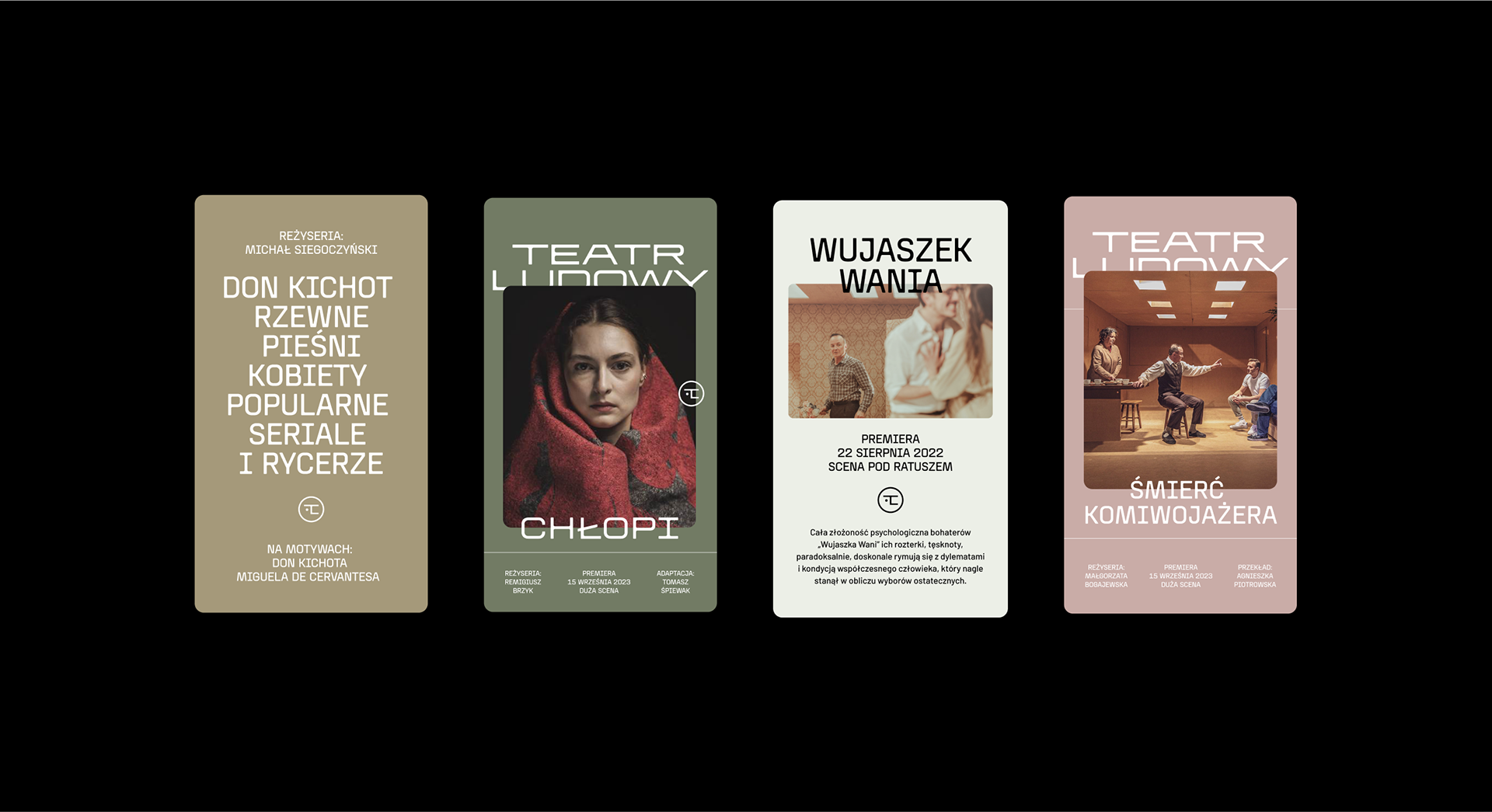 The custom-designed typeface “Ludowy” is a variable font, which makes it possible to change its width depending on the type and length of the text as well as its purpose. It works great when designing for different play name lengths, different occasions, various media: posters, repertoires, as well as animations and social media content.